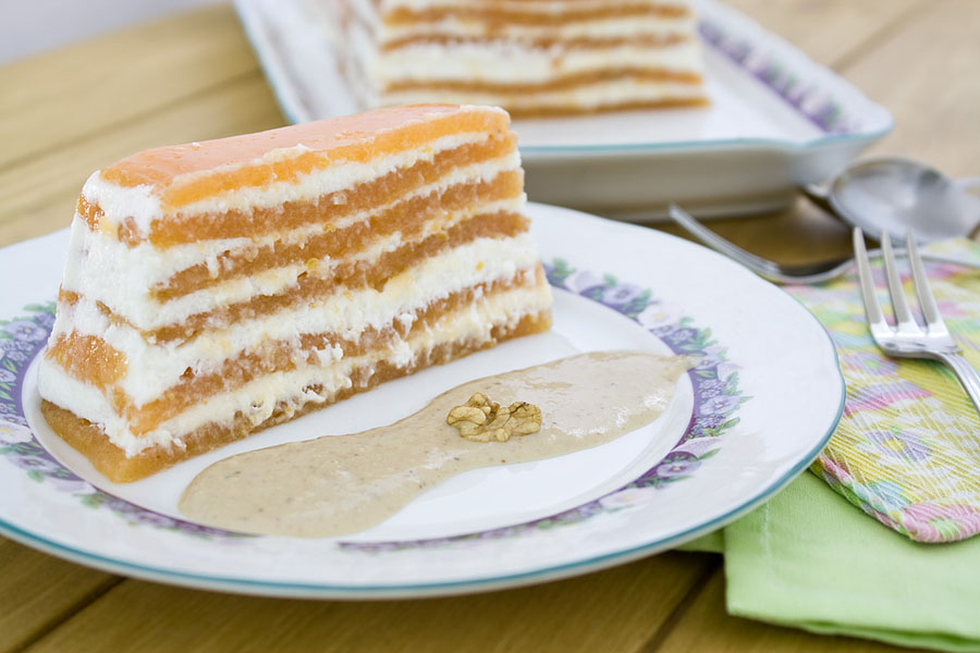 A la hora de servirlo lo desmoldamos y lo cortamos en lonchas. Y para que no falten las nueces, lo acompañamos con un poco de intxaursaltsa, que no es más que una salsa hecha a base de nueces, leche y azúcar, una crema tradicional de la cocina vasca.