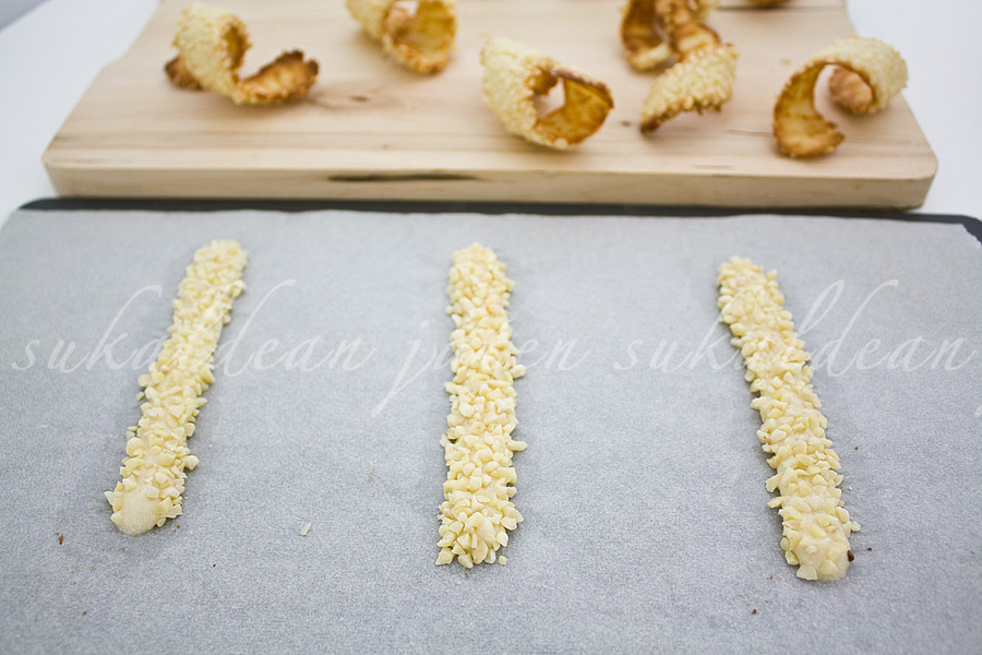 Forramos una bandeja de horno con papel de horno y lo precalentamos a 200 ºC. Metemos la mezcla preparada en una manga pastelera con boquilla lisa y escudillamos unas tiras de unos 10-15 cm, dejando espacio entre ellas pues al cocer aumentarán de tamaño. No poner demasiadas a la vez. Espolvoreamos generosamente cada tira con almendra en granillo, retiramos el sobrante, y horneamos durante 7-8 minutos o hasta que los bordes comienzan a dorarse. Sacamos la bandeja del horno y sin dejar que se enfríen, se van enrollando en un molde de canutillo o palo de madera para dar la forma de txirlora o viruta. Este paso hay que hacerlo con rapidez y si es con ayuda mejor, pues la galleta cuando se enfría se rompe y no se podrá dar forma. Una vez enrolladas, dejamos enfriar por completo antes de retirar el molde usado.
